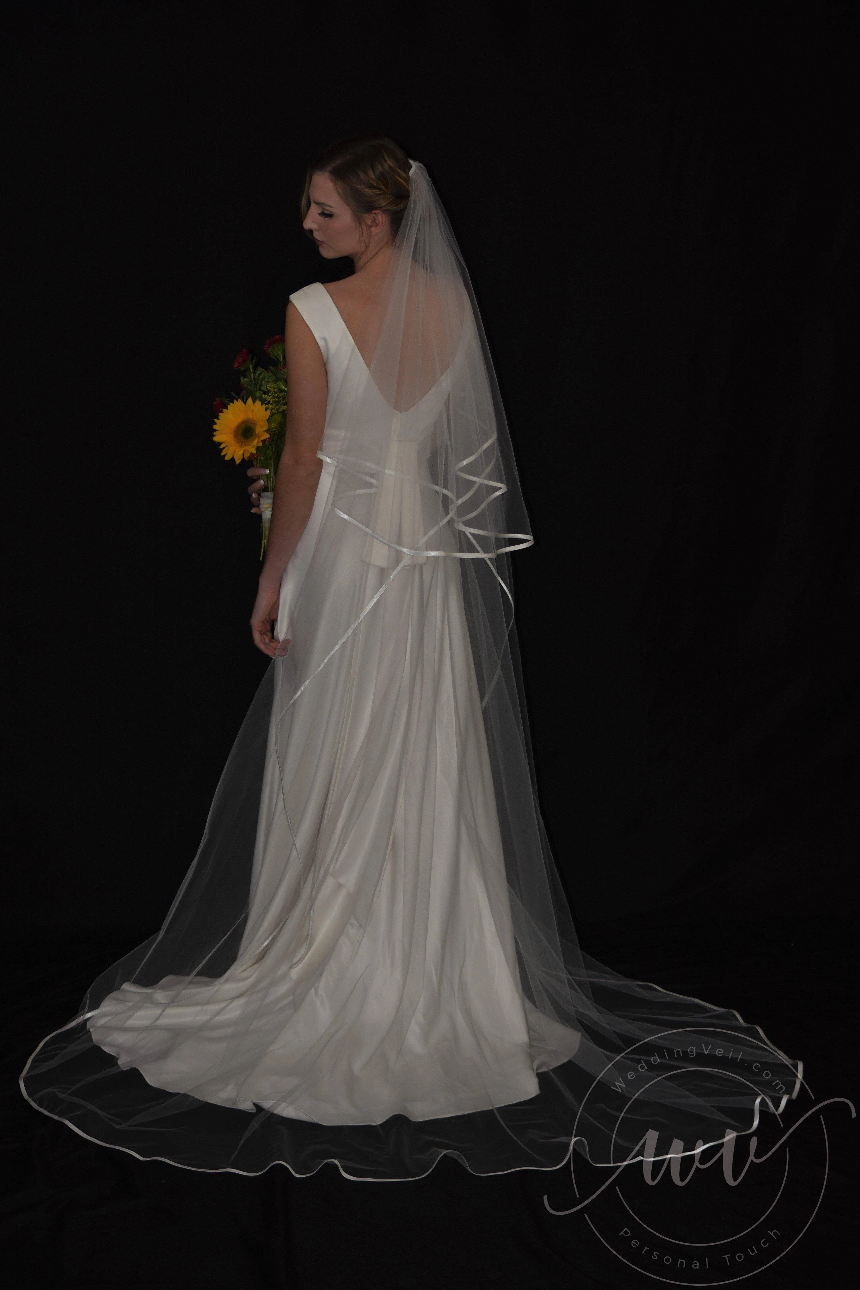This satin ribbon trim adds an amazing classic touch to the two-tier chapel length veil and also can be pulled over the face into a blusher.