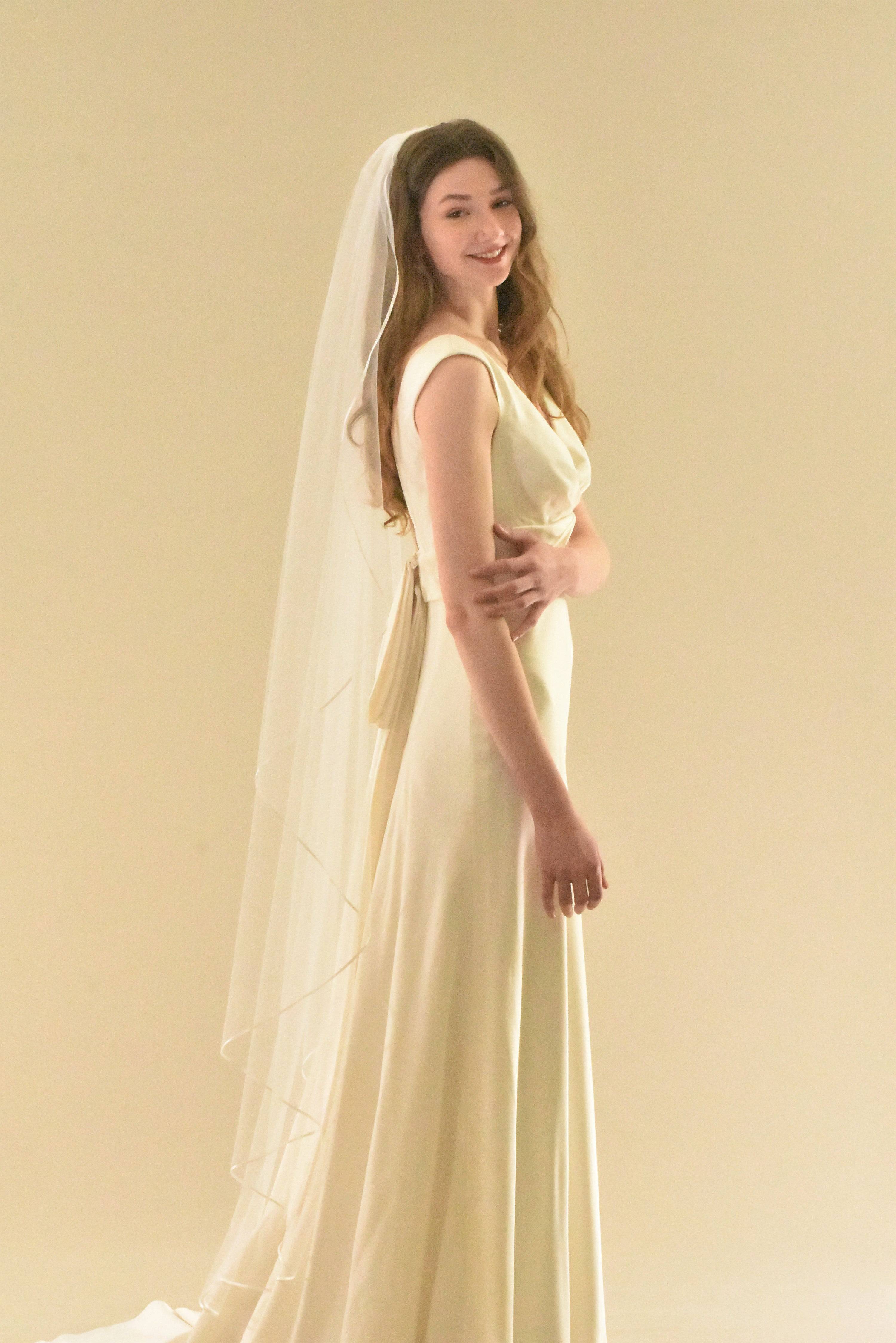 Single Tier Floor Length Veil with Thin Satin Ribbon Edge